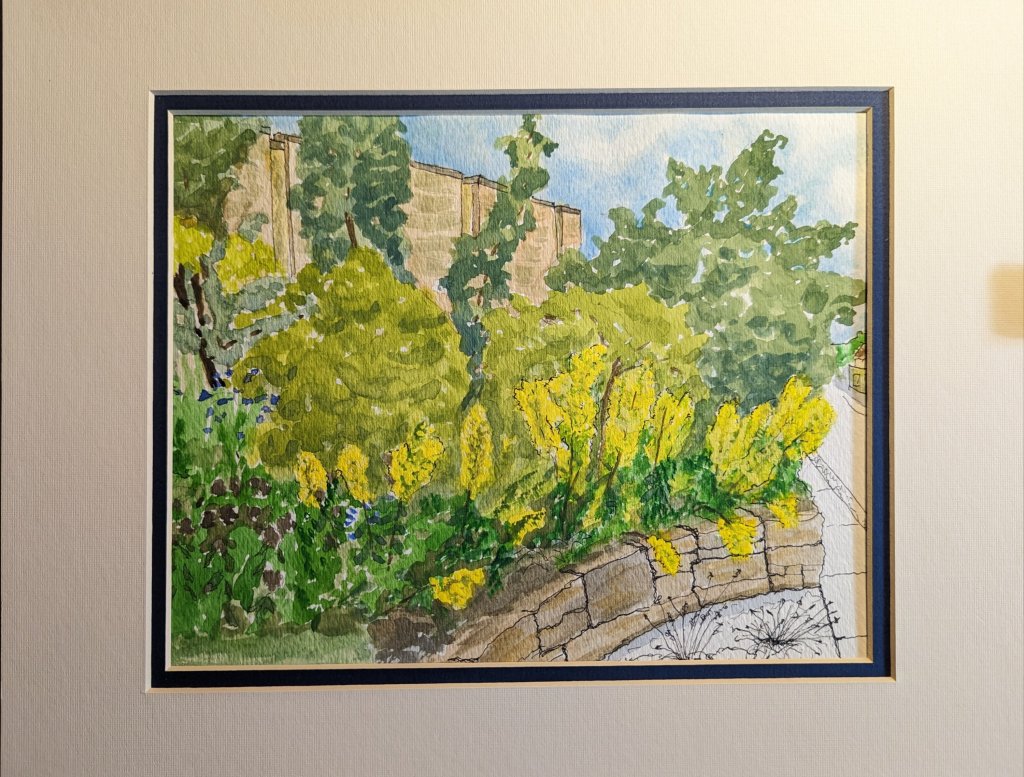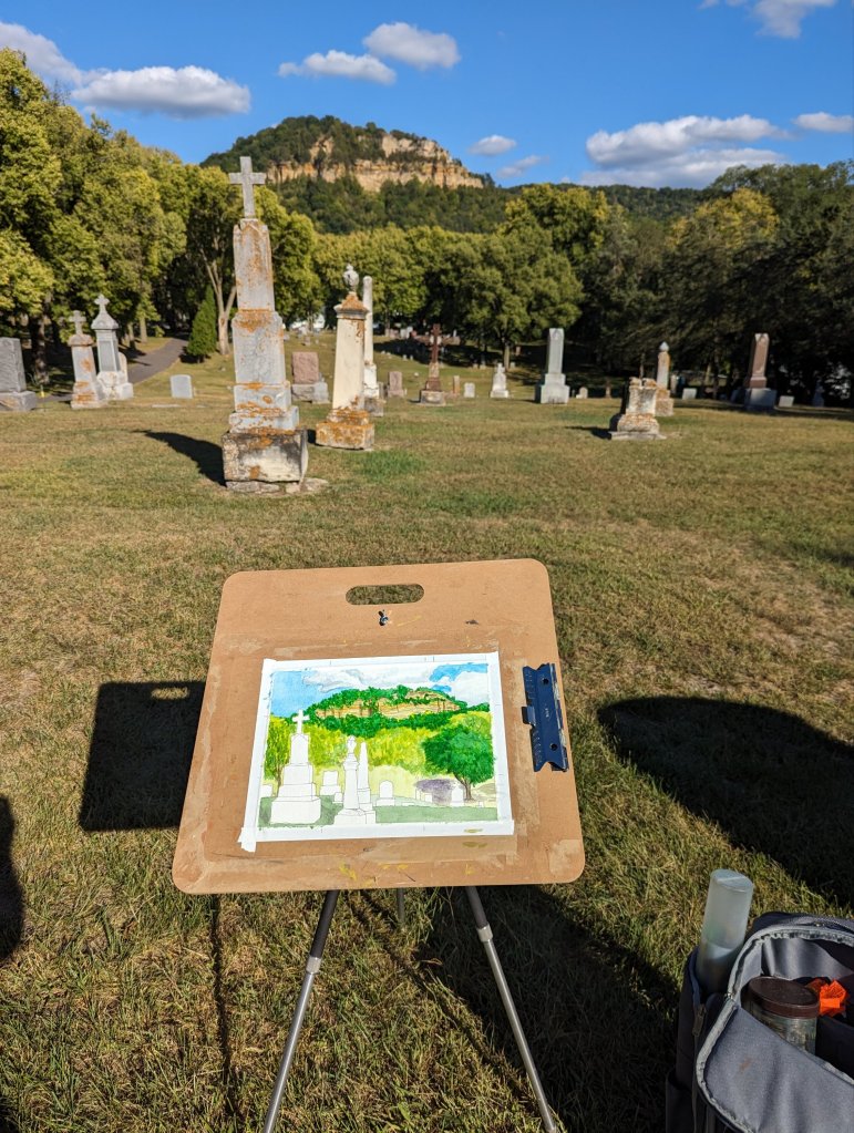 Plein Air involves the elements. The first session was rained out, and the following day dark clouds approached as I finished up. The cemetery and the food forest had easier weather conditions. Here are some process pictures.