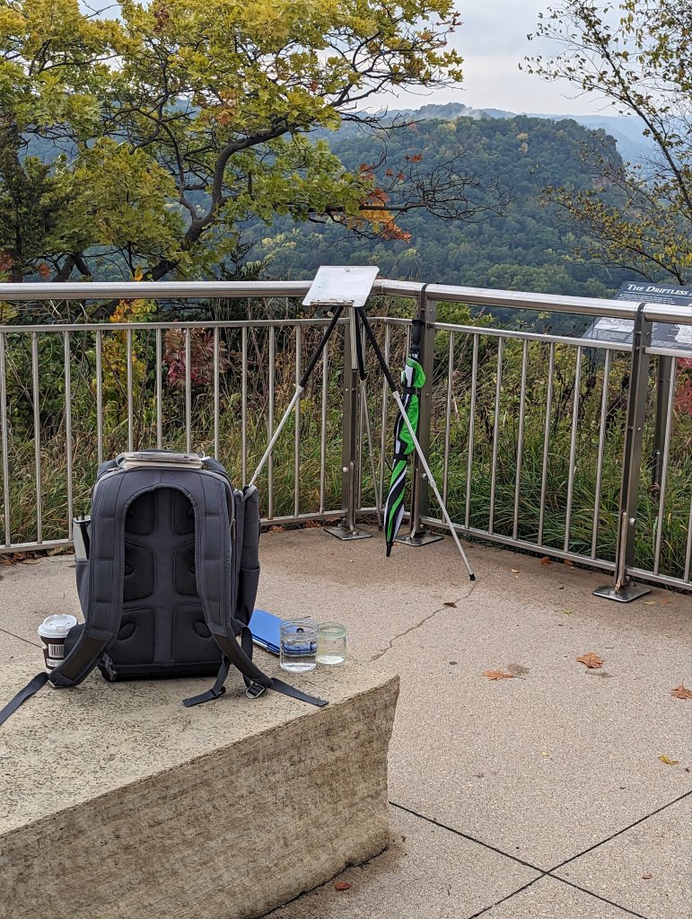 My kit is a modified camera tripod, and what fits in a backpack, and on this day an umbrella.