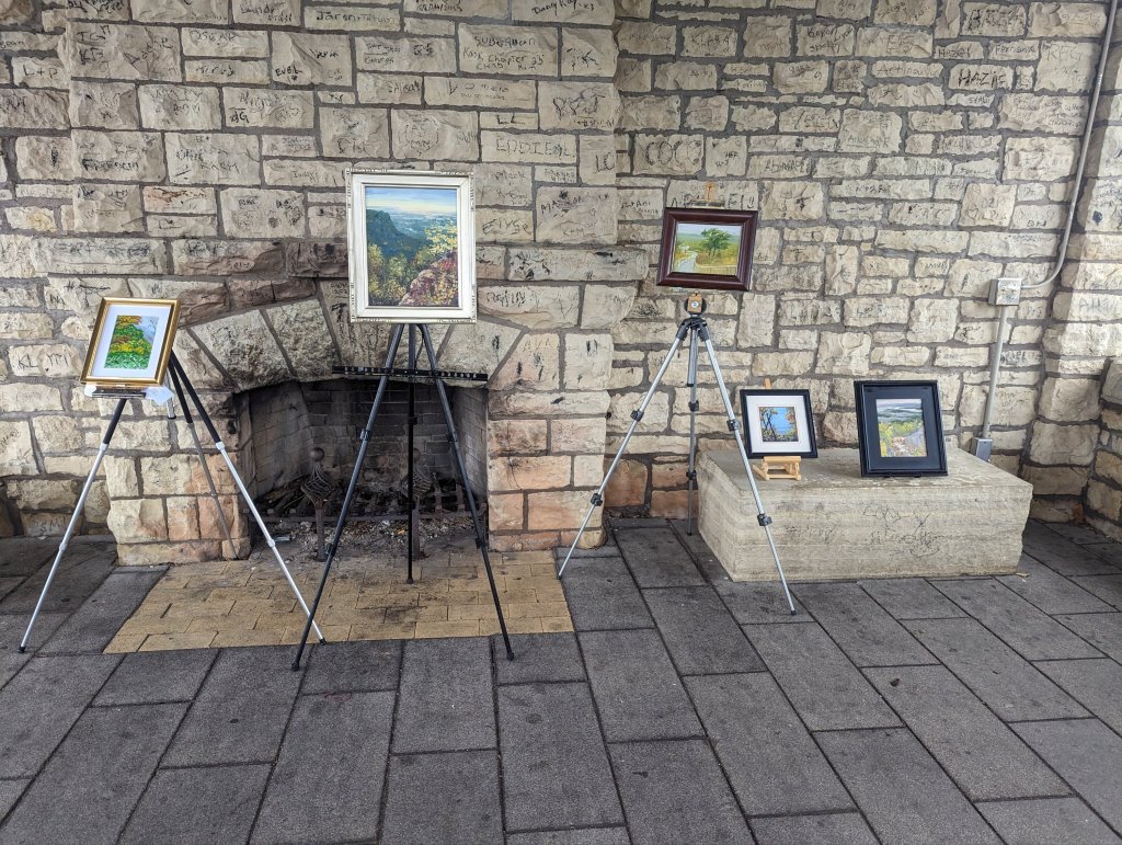 I joined the Between the Bluffs Plein Air event, which included a quick paint (two hours) from the top of Grandad’s Bluff. From this vista rain could be seen to our West and North, but we were ok up to a point.