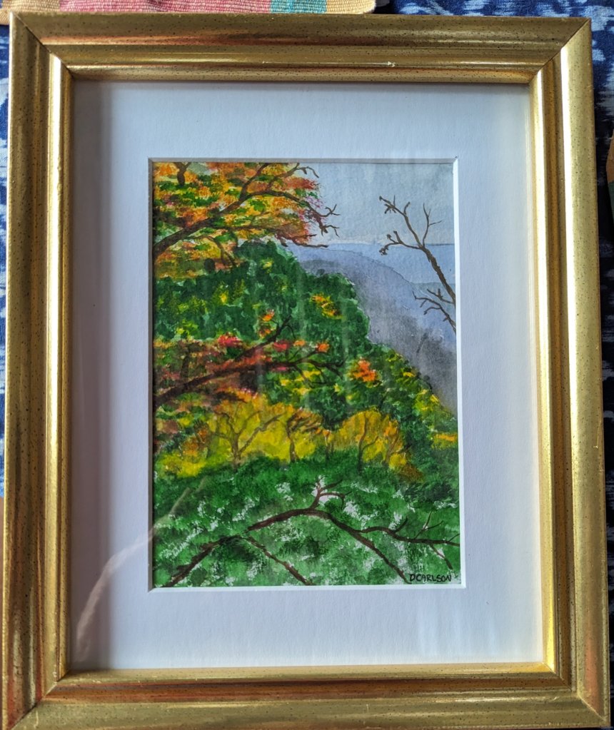 I struggled with the medium in that the watercolor did not dry as quickly as usual, so my tree colors blended together more than expected.
