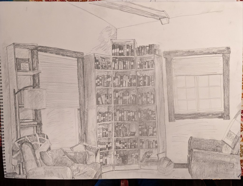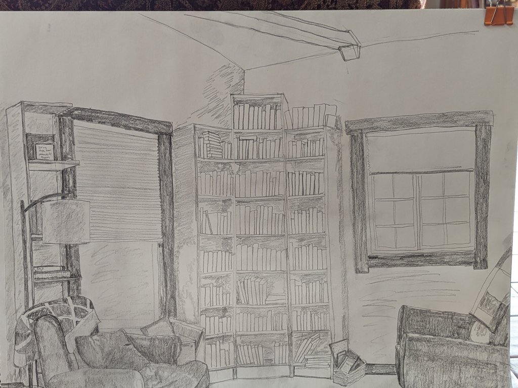 The next assignment was to draw a room in the house showing the corner, a window and a chair. Our open concept house has fewer corners to pick from. The only option features a set of bookcases.