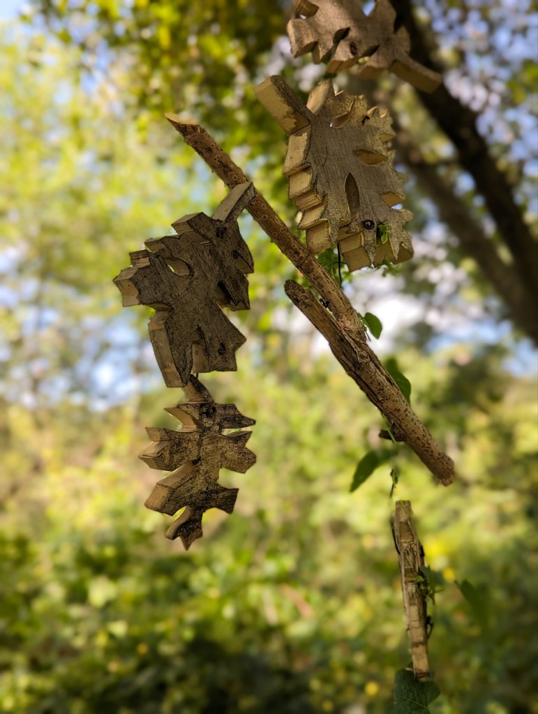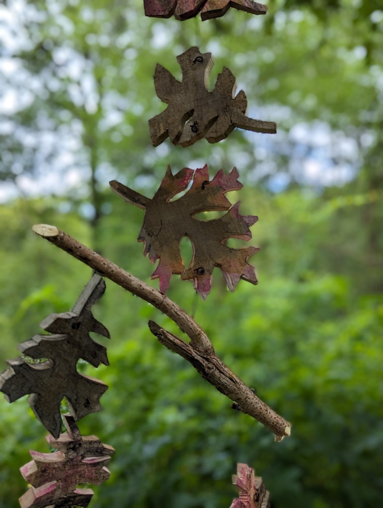 These leaves are cut from trees felled from the grounds at the Farley Center. The leave shapes are from this tree. The colors are from the weather and natural stains.