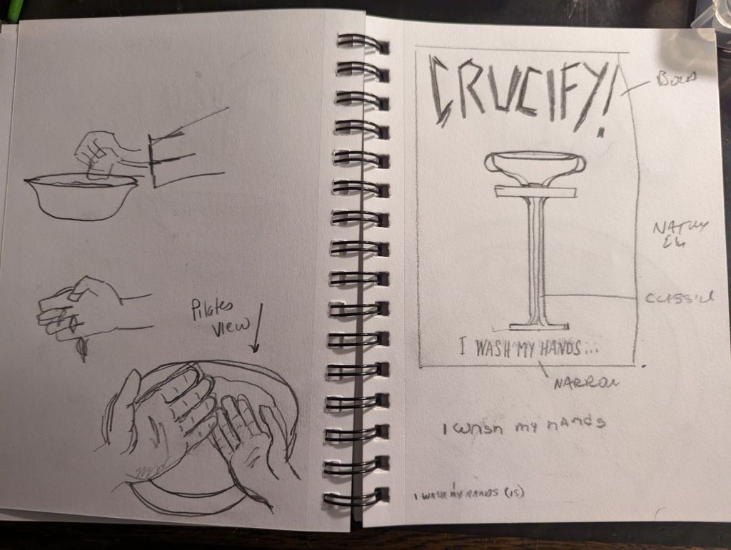 I’ve decided to feature the judgment of the crowd to crucify him, and to see Pontius Pilate’s hand washing. This is seen from Pilate’s Point of view.