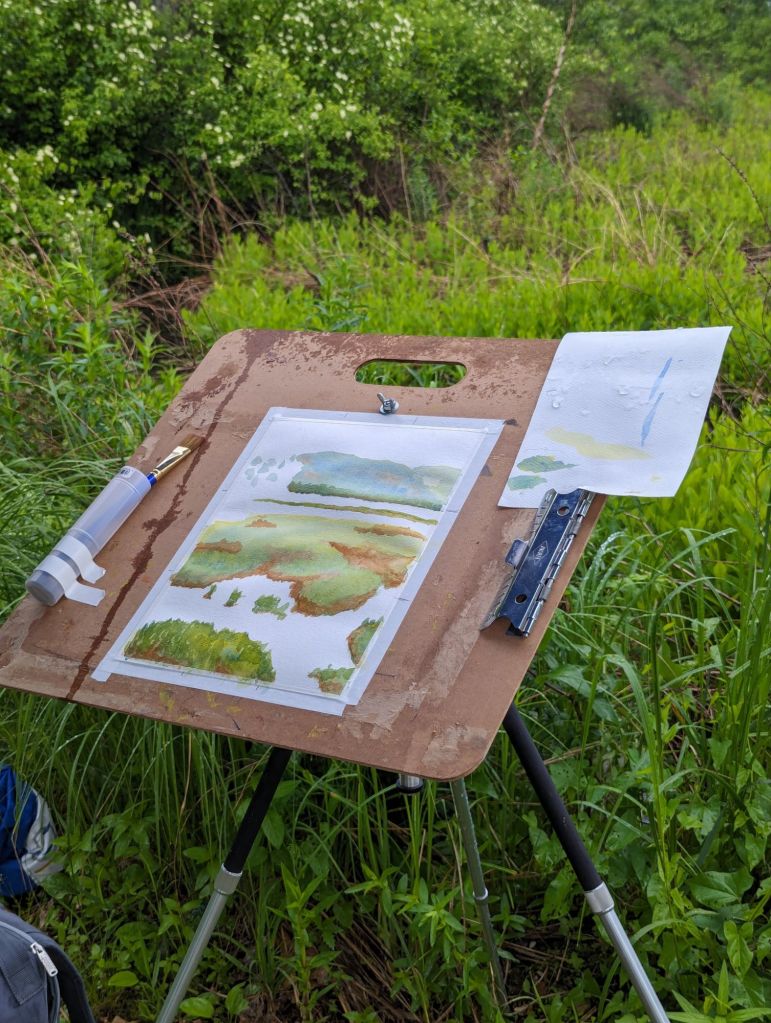 It was raining for the Plein Air event on Saturday, so I brought a canopy. That helped but the added moisture gave the watercolors a life of their own. The result was a soft effect. Since the water did not dry as normal it was hard to know what would happen.