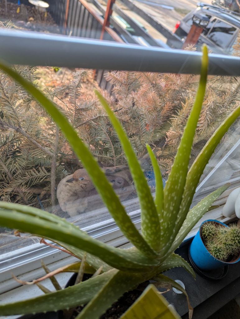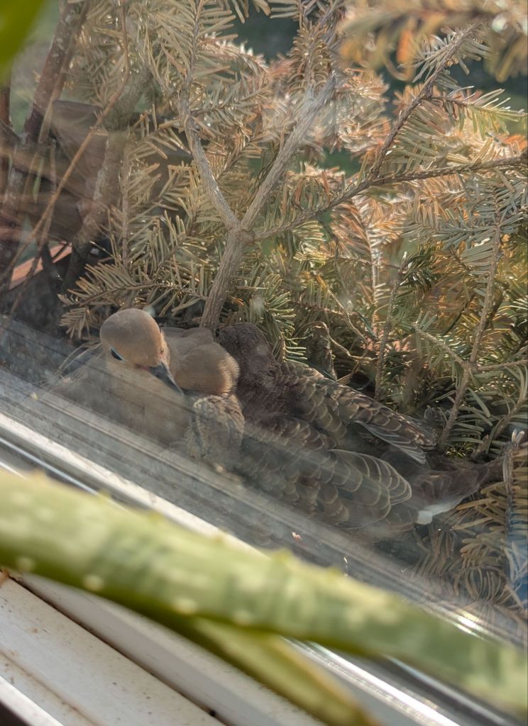 Mourning Doves nested and raised two babies in full view of our kitchen window. We have window boxes with lights and greens from Advent that made a good nesting area