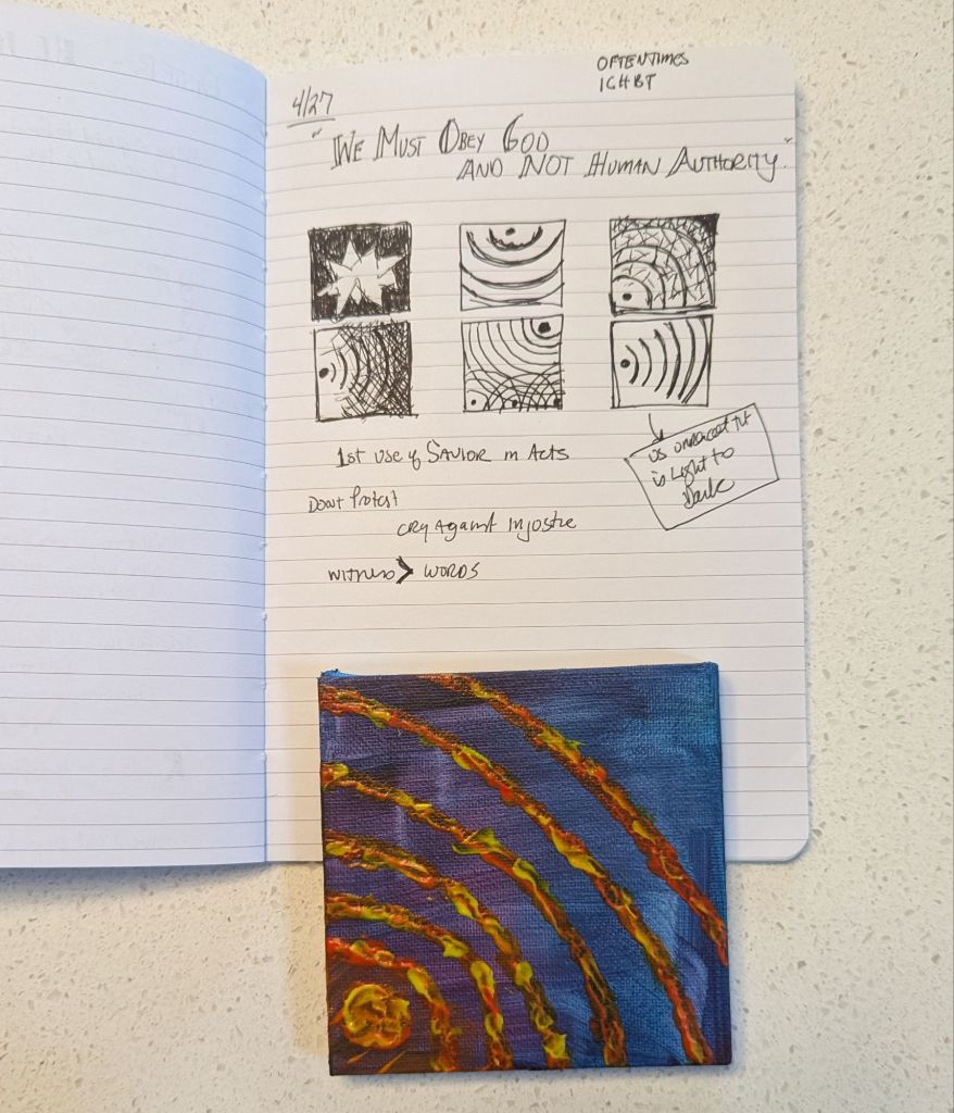 I always take notes. In the blue collar town of my youth I learned note taking at church, not school. Art classes have added making thumbnail sketches to explore an idea. This abstract expresses speaking into the darkness.
