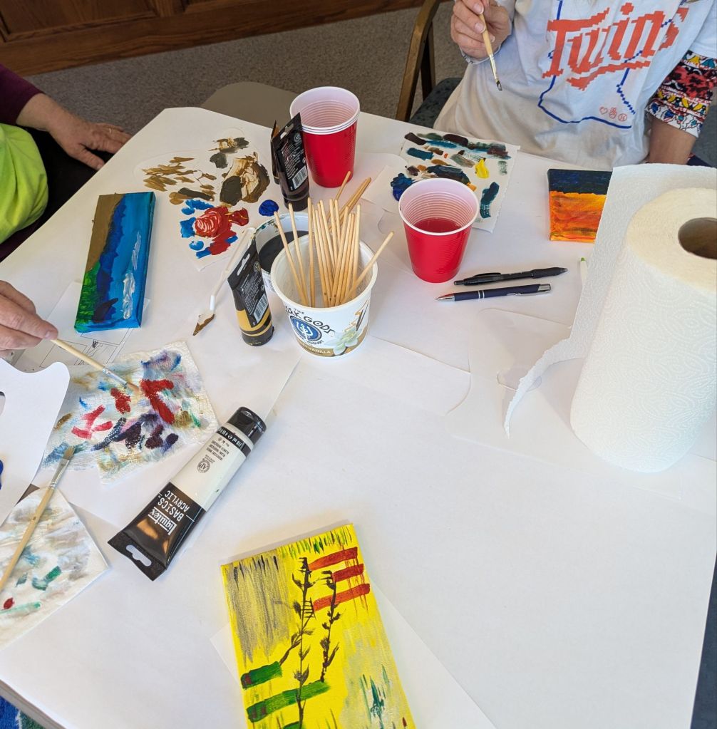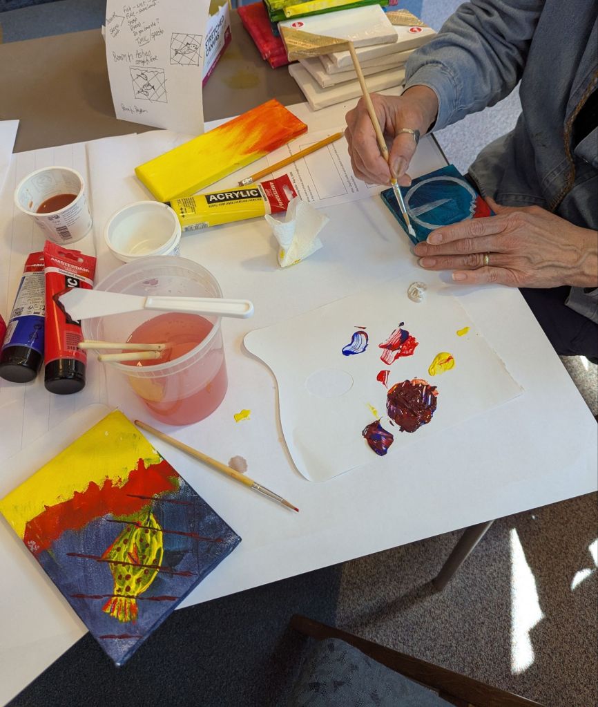I’ll be suggesting listening for an idea, phrase or image that strikes the participant and then expressing that on a small canvas in acrylic paint.