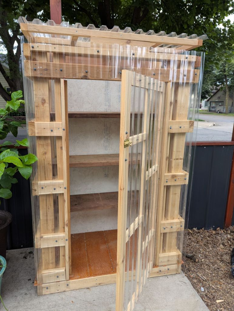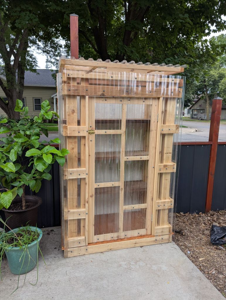 The greenhouse is made with cedar lumber and clear acrylic panels.