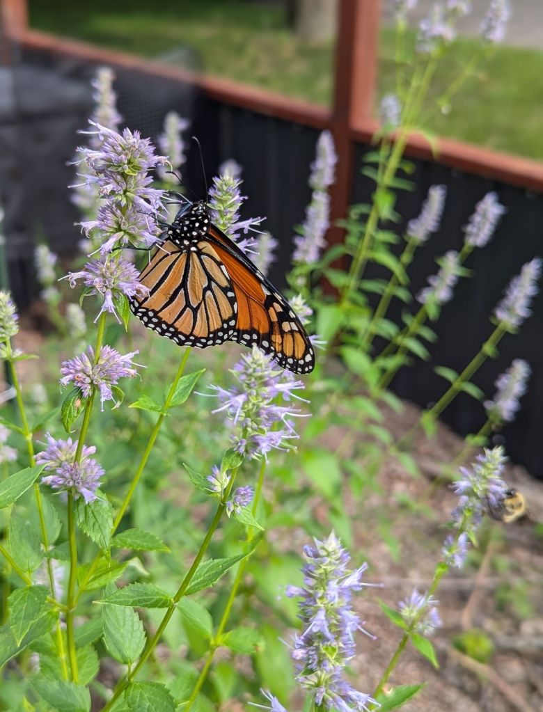 You think your lawn is a space, but to pollinators it is the equivalent of pavement. We have some natives as well as annuals in our yard. The bumble bees and butterflies love our hyssop. Later they will be all over the asters.