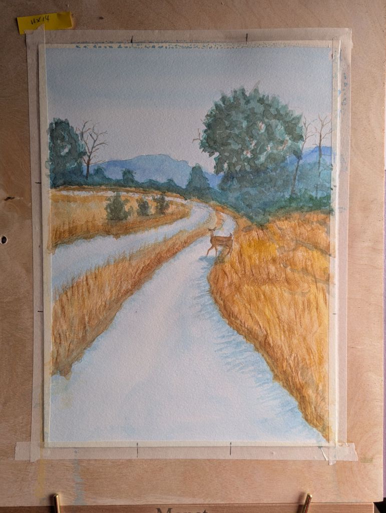 I’m working on a watercolor, using Daniel Smith moonglow for the sky. It’s taking multiple washes to get darkness. I’ve masked here and there, so I hope the moon and streetlight pop after I remove that.