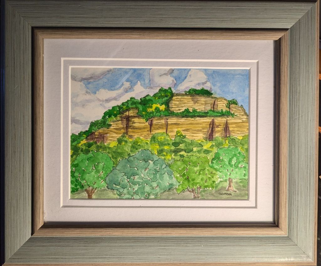 Cliffwood Bluff This view is from a park near the base, on a day with threatening clouds. In fact I had to find shelter as I painted. Watercolor and rain do not coexist.