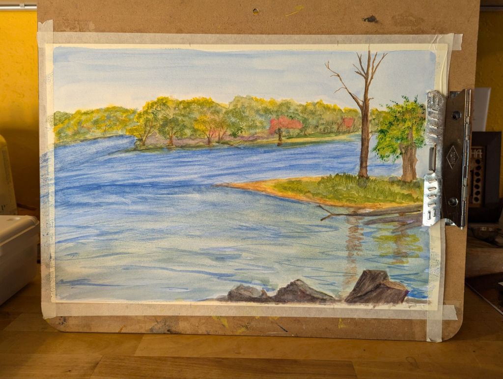 Smooth water I’d started on the water before it became mirror smooth. That would have been a different picture. My paper was 140 lb cold press, which was quite textured. I’d have needed hot press, a smoother paper. (Note to self).
