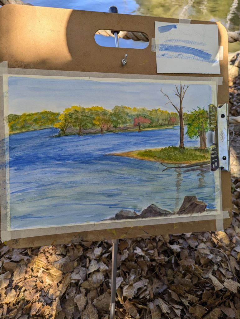 My second effort for Between the Bluffs is this scene of Isle la Plum on the La Crosse waterfront. I wanted to get evening color. So I left at 3 pm to find my spot and draw in the scene. I was hoping for sunset colors to arrive and then I’d add them quickly.