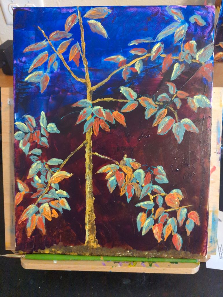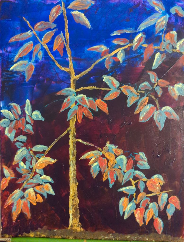 The background is a fade from blue to burned umber with some lavender. I used an acrylic pen to draw in leaves. The painting is free-alistic.